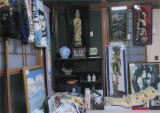 奥は元書斎 今はここでは書きものはしておらず、パンフレットとチラシの置き場と化している パンフの方は殆ど増えていないが、チラシの方は増える一方で、以前は五十音順に箱に詰めていたが、今は怠けて「アレ、どこへ置いたかな?」状態 キャサリン・ヘプバーン、美空ひばり、ルキノ・ヴィスコンティ、原節子の油彩 他に入口に吉田カツ、岡林信康、スターマン/デヴィッド・ボウイ、そして愛しのモニカ・ヴィッティとマリア・シュナイダーさま |