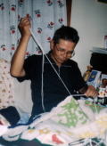 横に方眼紙と写真を置き、小品なら1〜2週間。大作の「般若心経」タペストリーは半年を要しました。縁以外は、すべてメリヤス編みです。